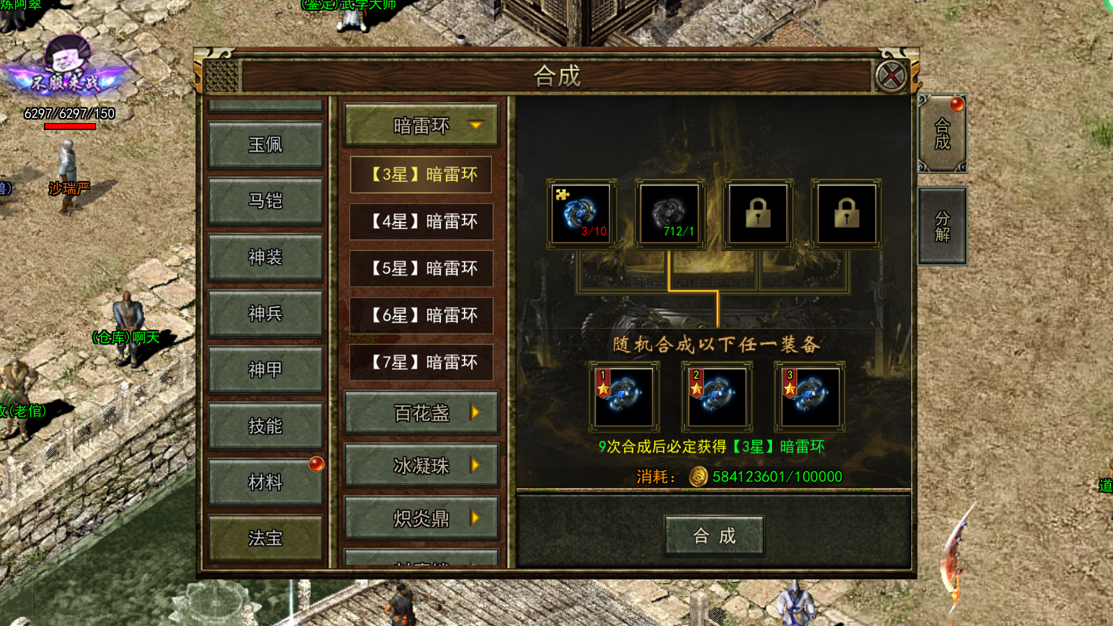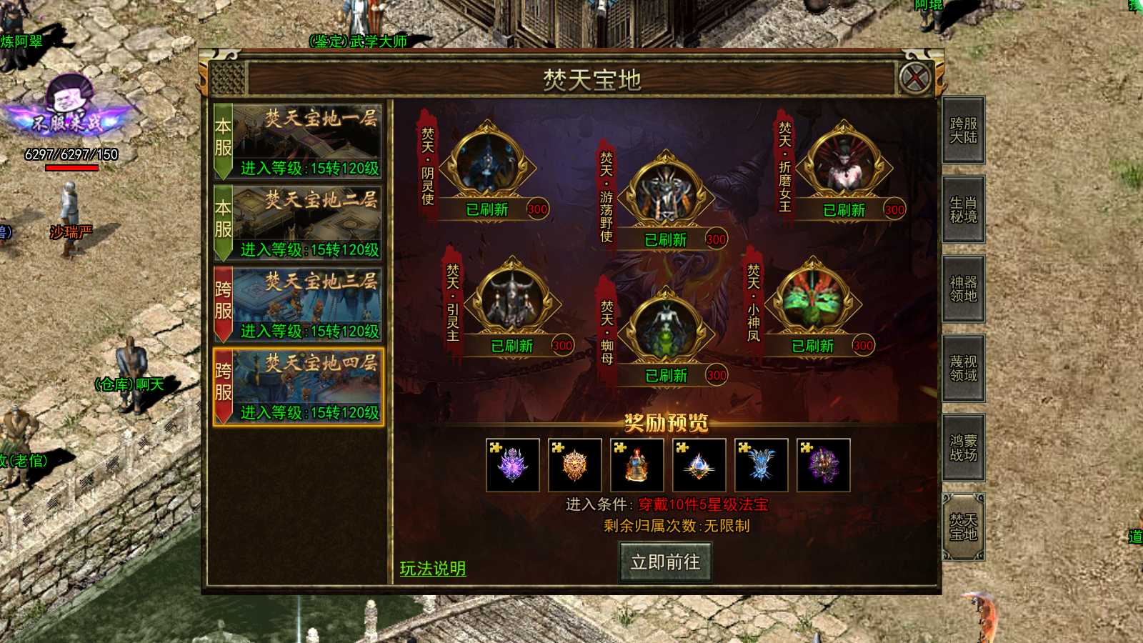 「焚天法地」玩法,主要获取法宝升星的材料,不同层数进入要求不同,分本服层和跨服层。