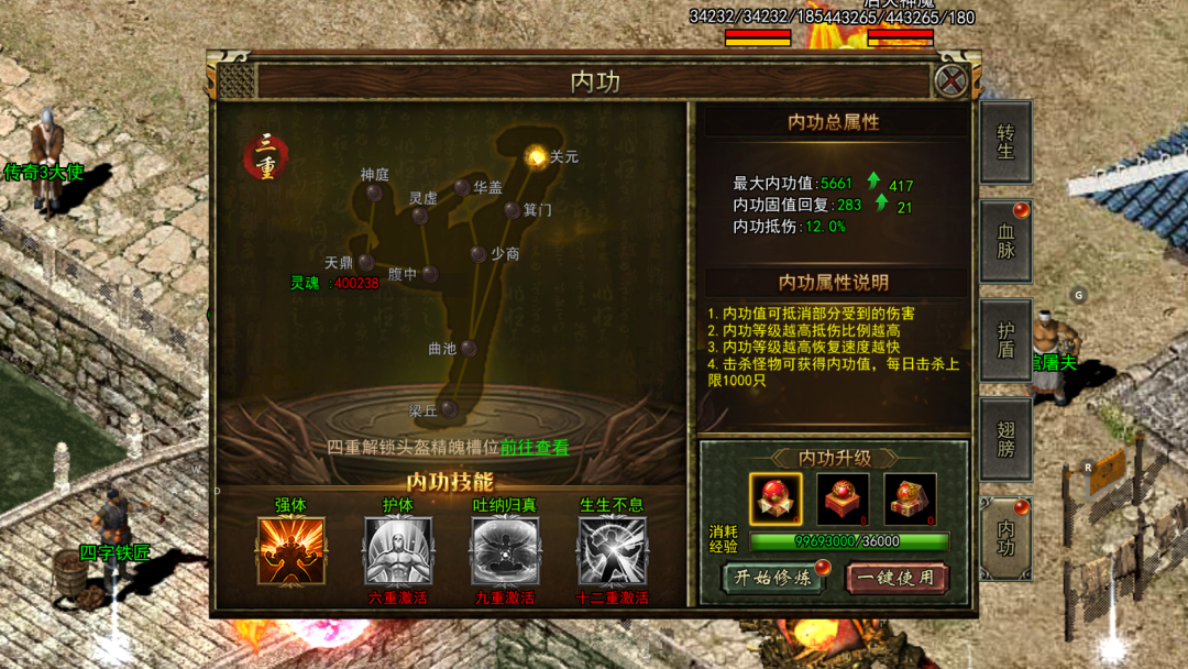 开服60天,新增「内功系统」,开启后可获得内功值,受到的伤害可以根据内功值和内功减伤,可抵扣部分伤害;