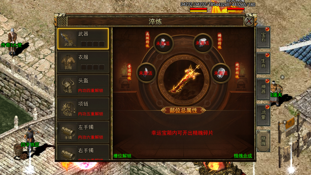 升级内功达到指定等级,可解锁装备「内功孔位精魄」,每个部分可镶嵌4种精魄石,穿戴后可提升内功值的上限和内功回复速度。